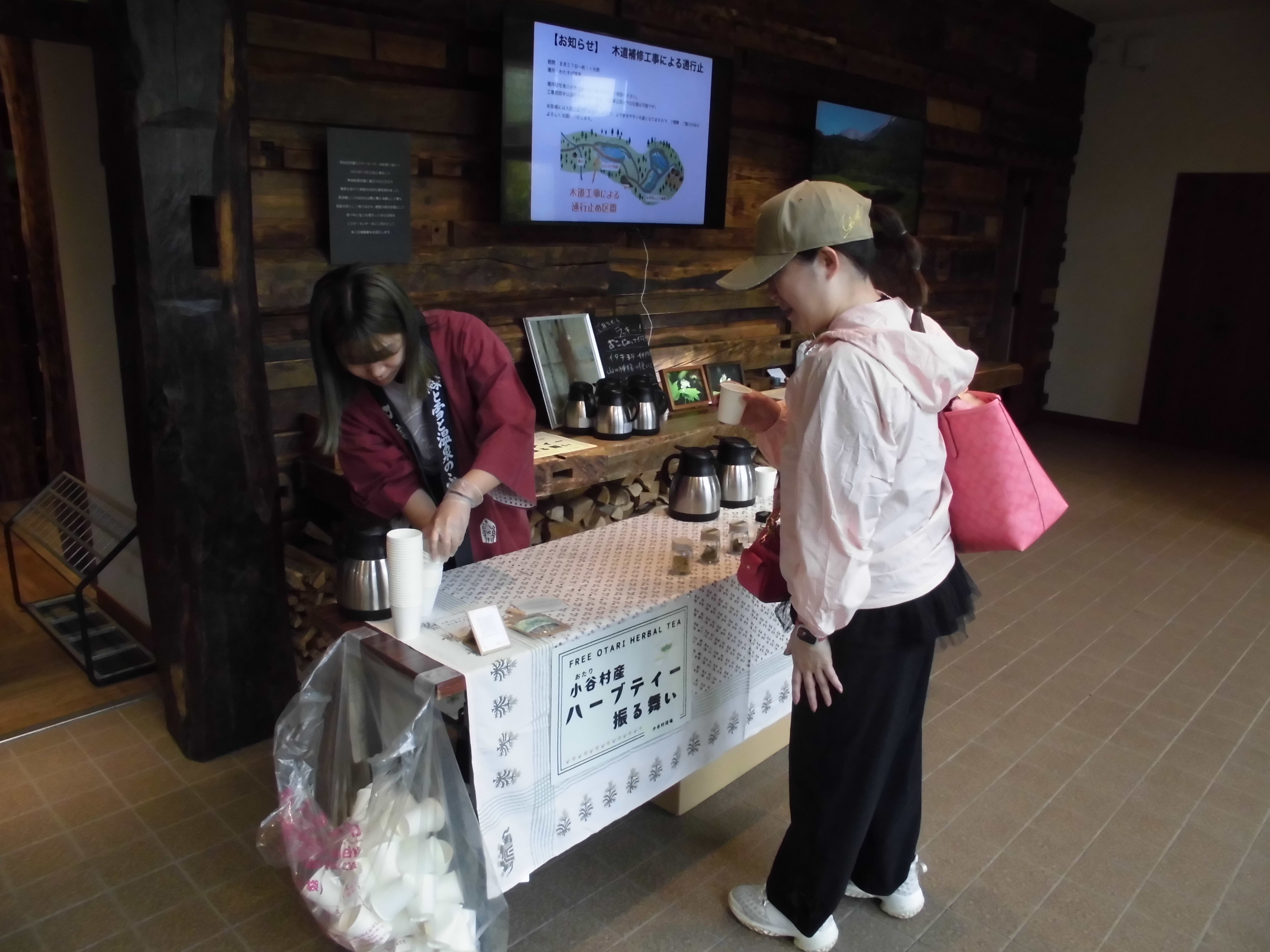 栂池ヴィジターセンター内では「「小谷村産ハーブティー」振舞い