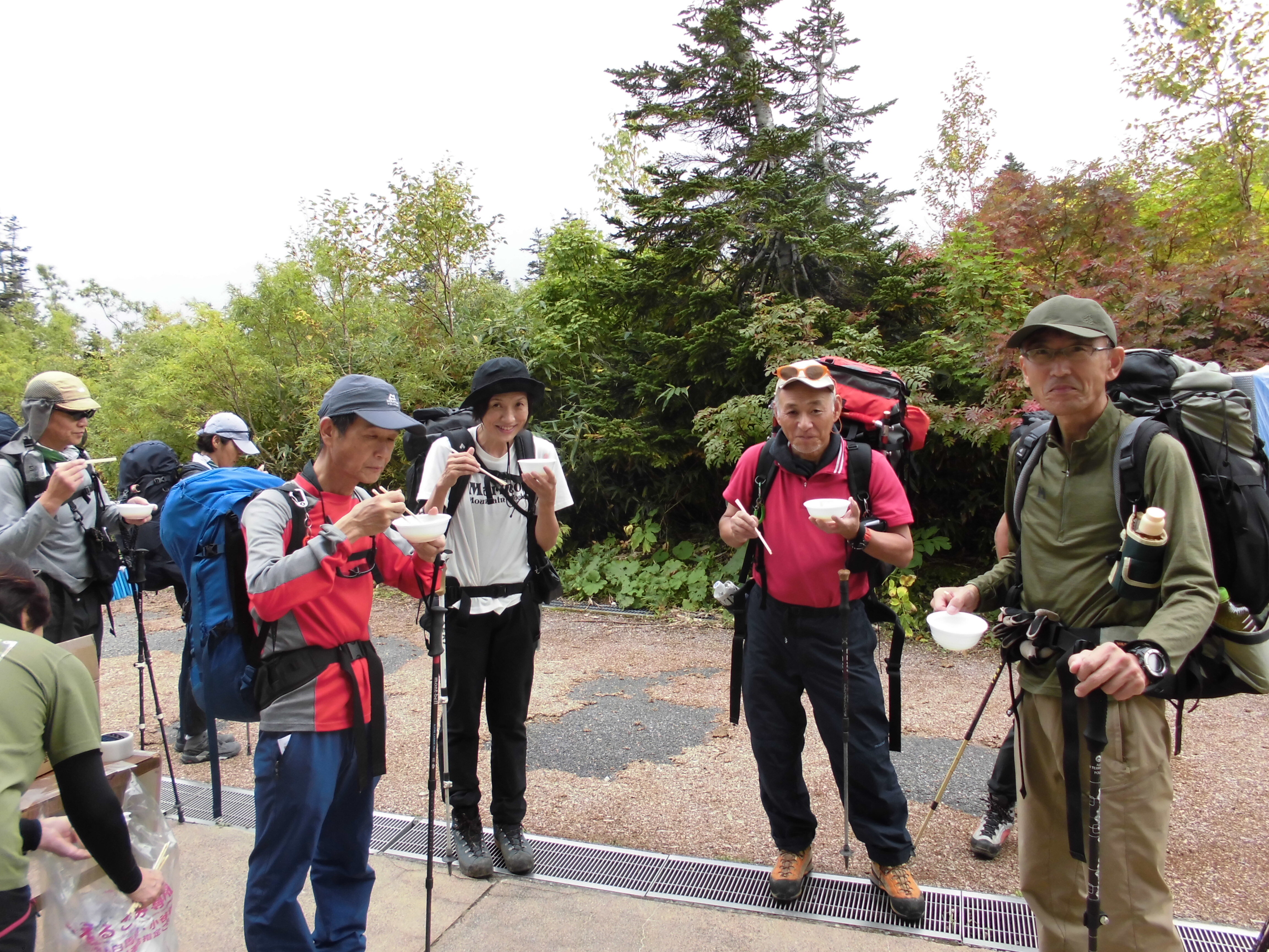 栂池山荘正面では「きのこ汁」の振舞い